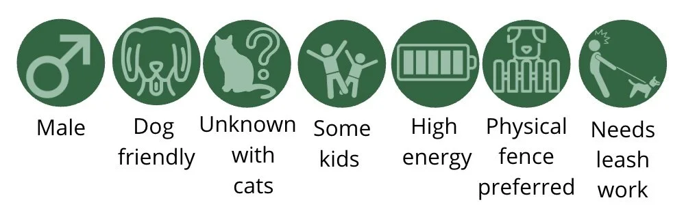 Right now, I’m living with two other dogs. We all like being together, but they can’t always keep up with my play drive. My forever home would ideally have space for me to burn off that energy whether with dog friends who match my vibe or just lots of human playtime and activity! I have not had direct interactions with cats.