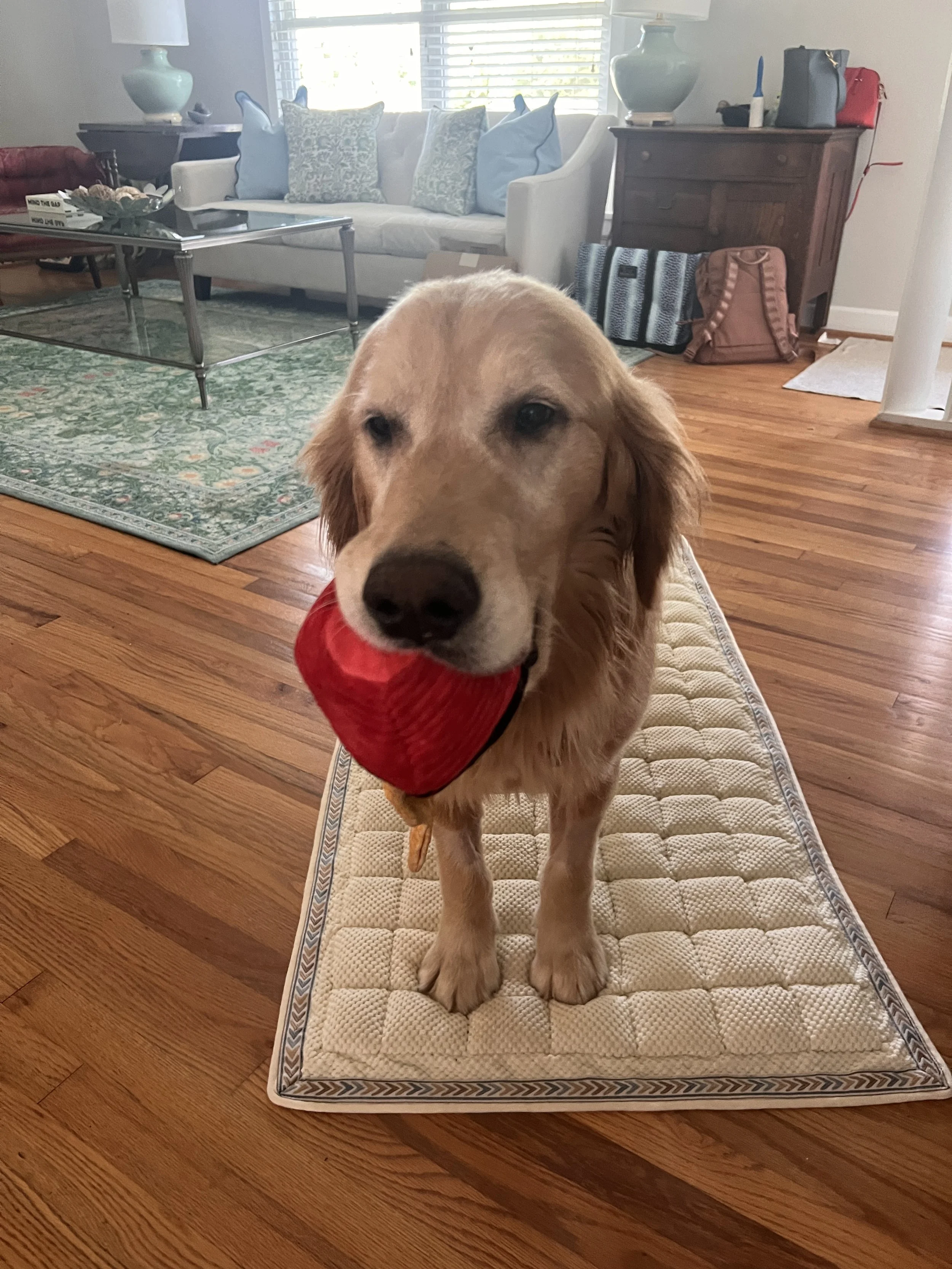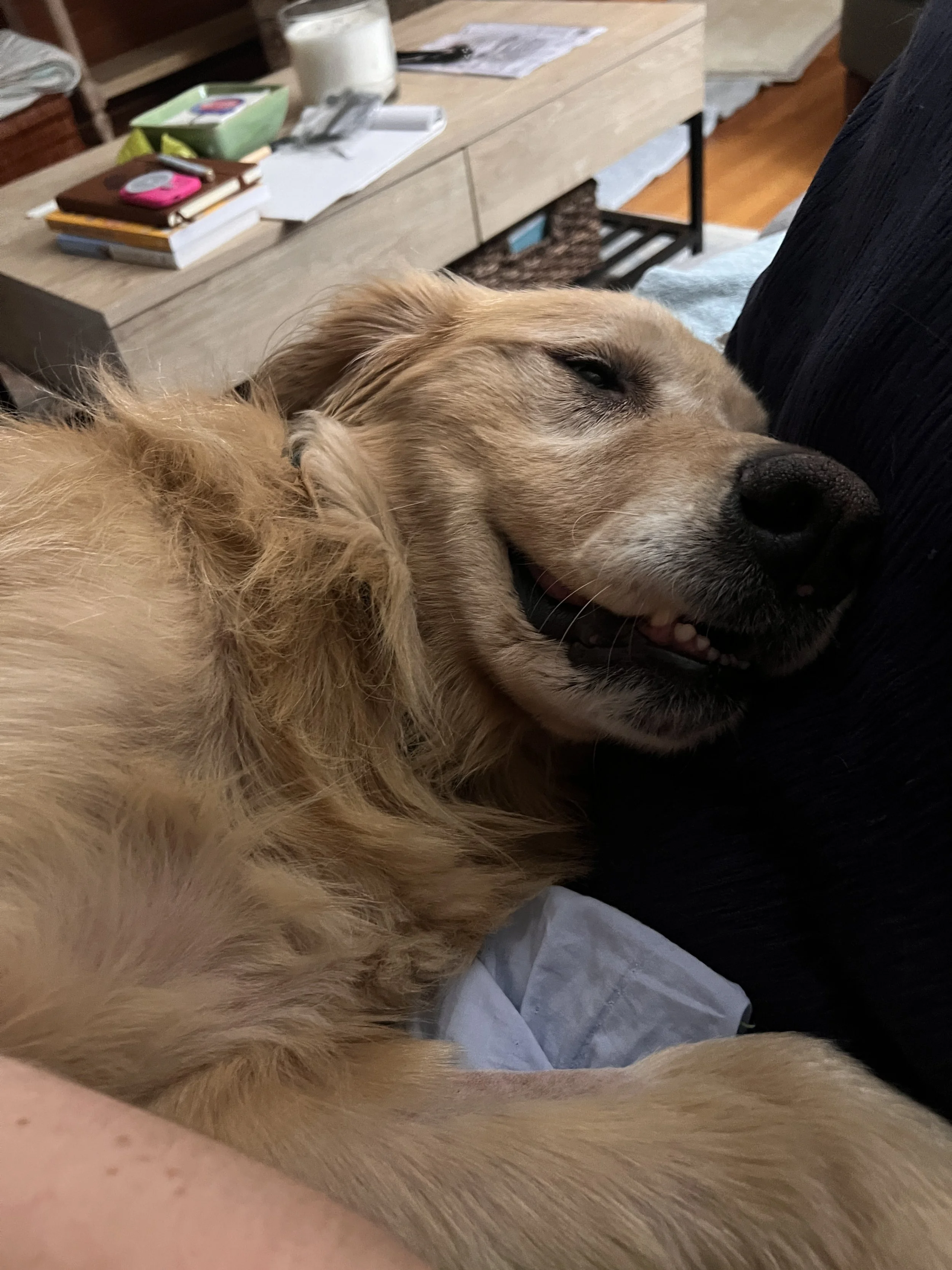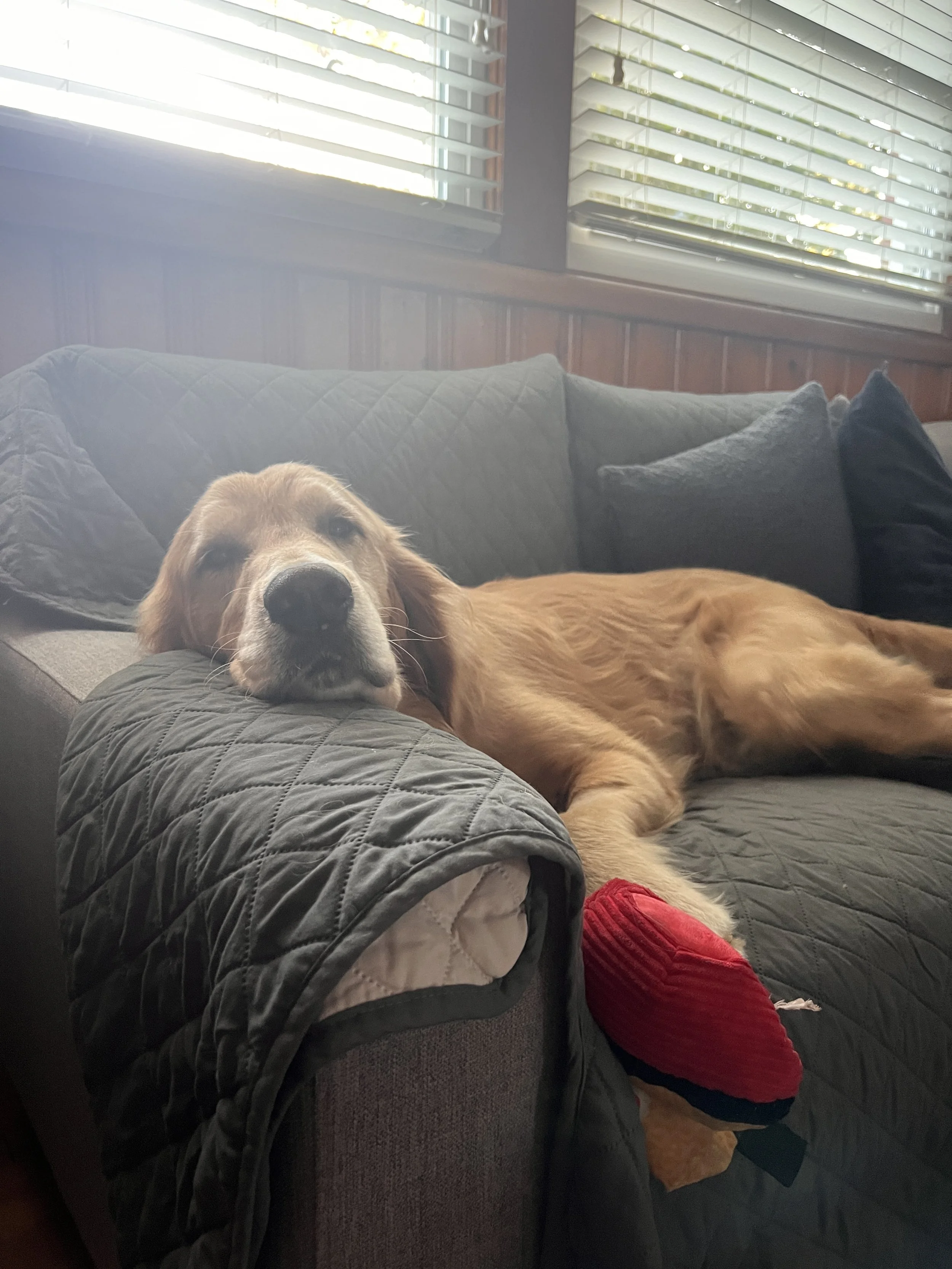 Galen is a typical golden retriever in many ways: he is a velcro dog, loves his toys, and loves to be around people. However, he is a whopping 94lbs which is not typical for a golden. Galen is the epitome of a gentle giant. He slowly follows you around the house and lays down in your lap when it’s time to relax. Wanting a weighted blanket for the winter? Galen is your guy!