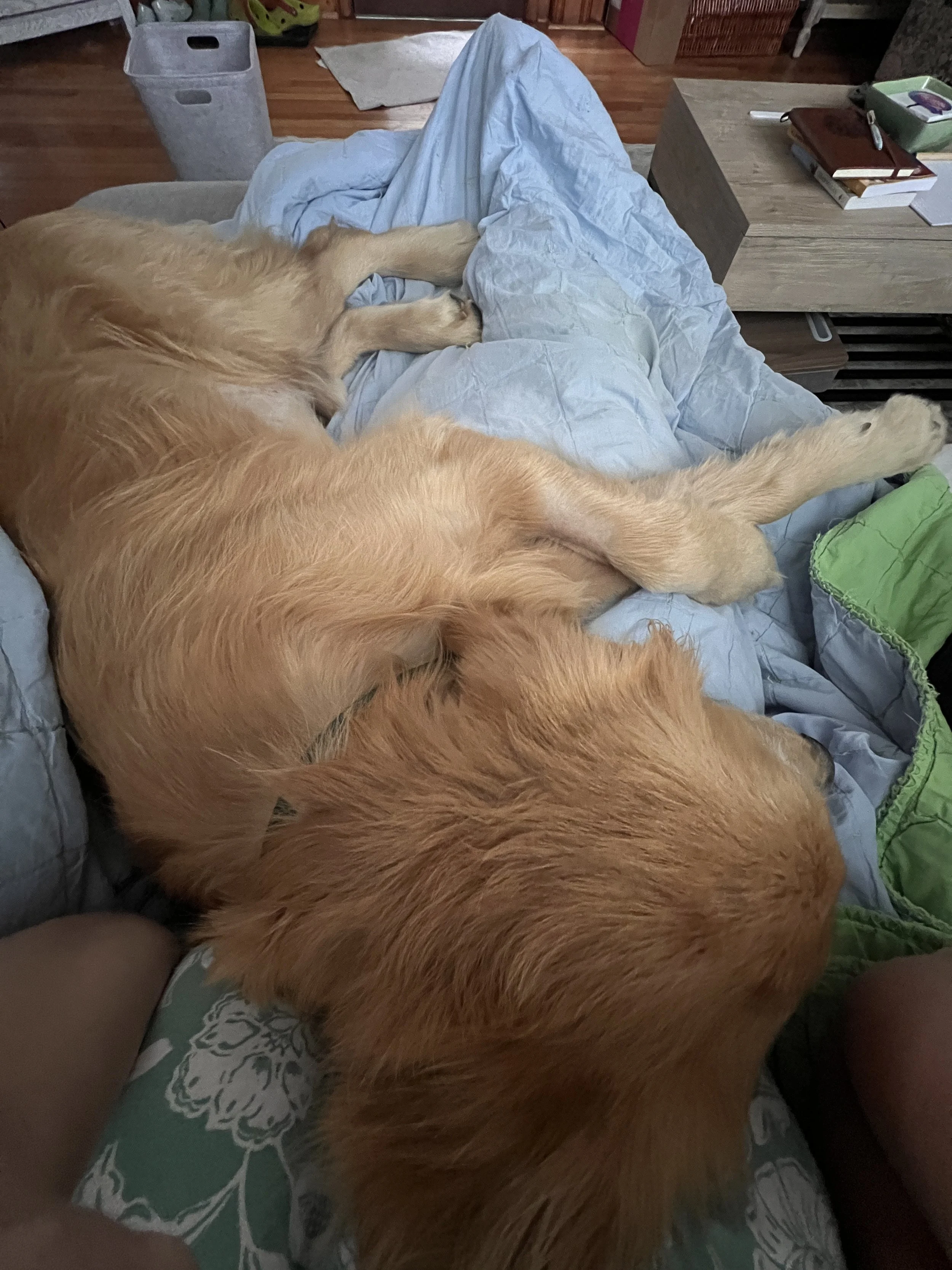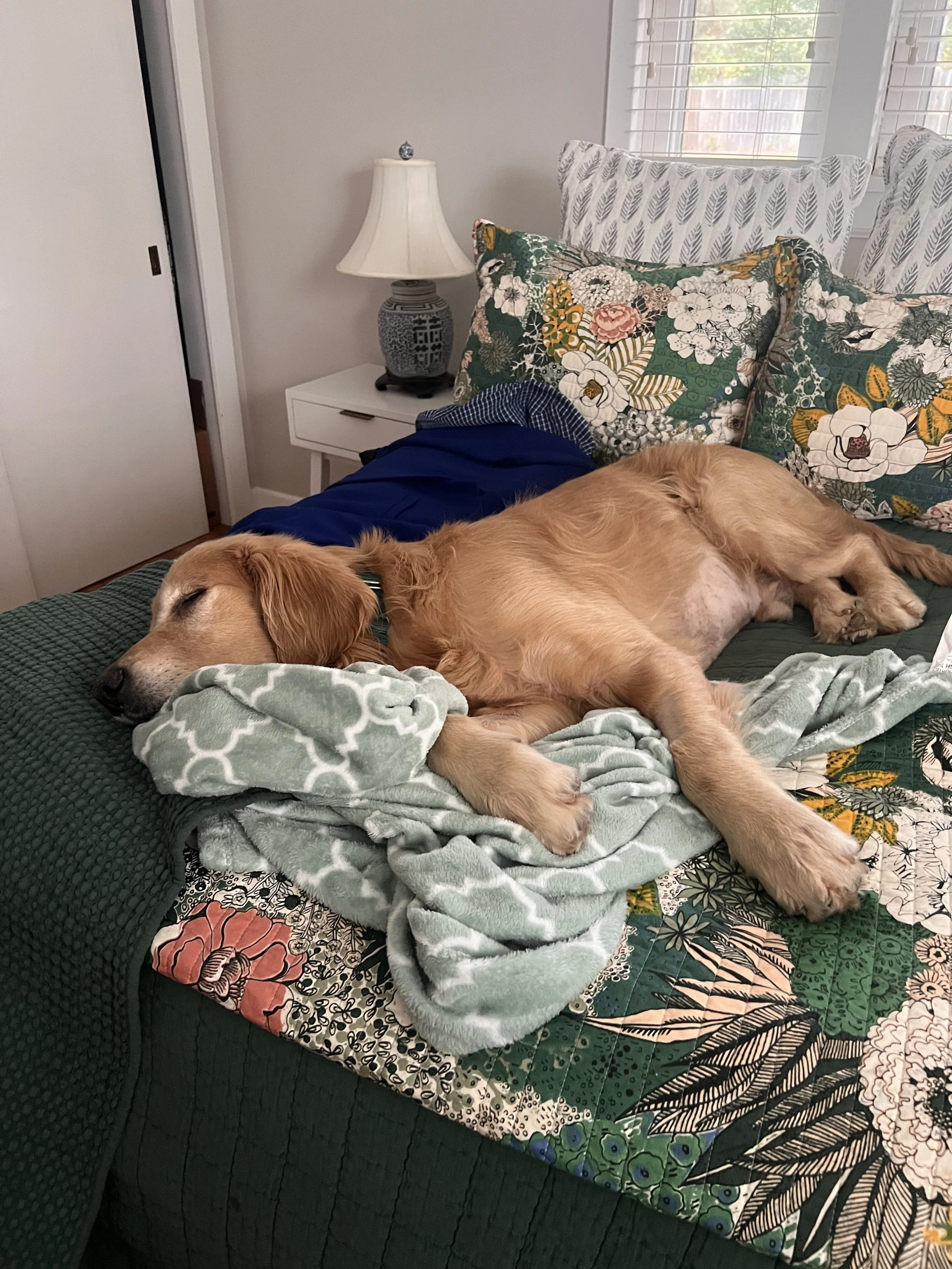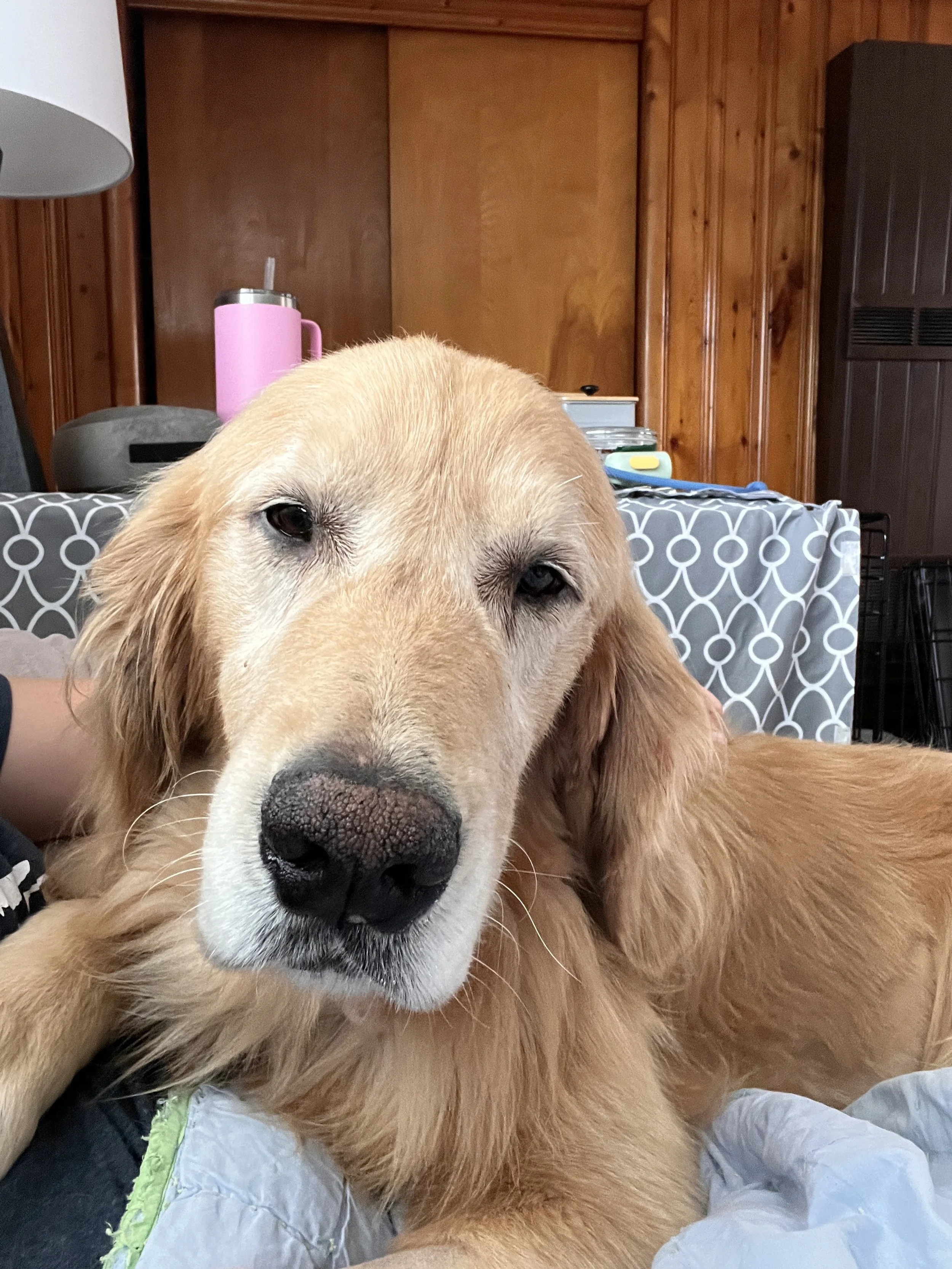Galen is a typical golden retriever in many ways: he is a velcro dog, loves his toys, and loves to be around people. However, he is a whopping 94lbs which is not typical for a golden. Galen is the epitome of a gentle giant. He slowly follows you around the house and lays down in your lap when it’s time to relax. Wanting a weighted blanket for the winter? Galen is your guy!