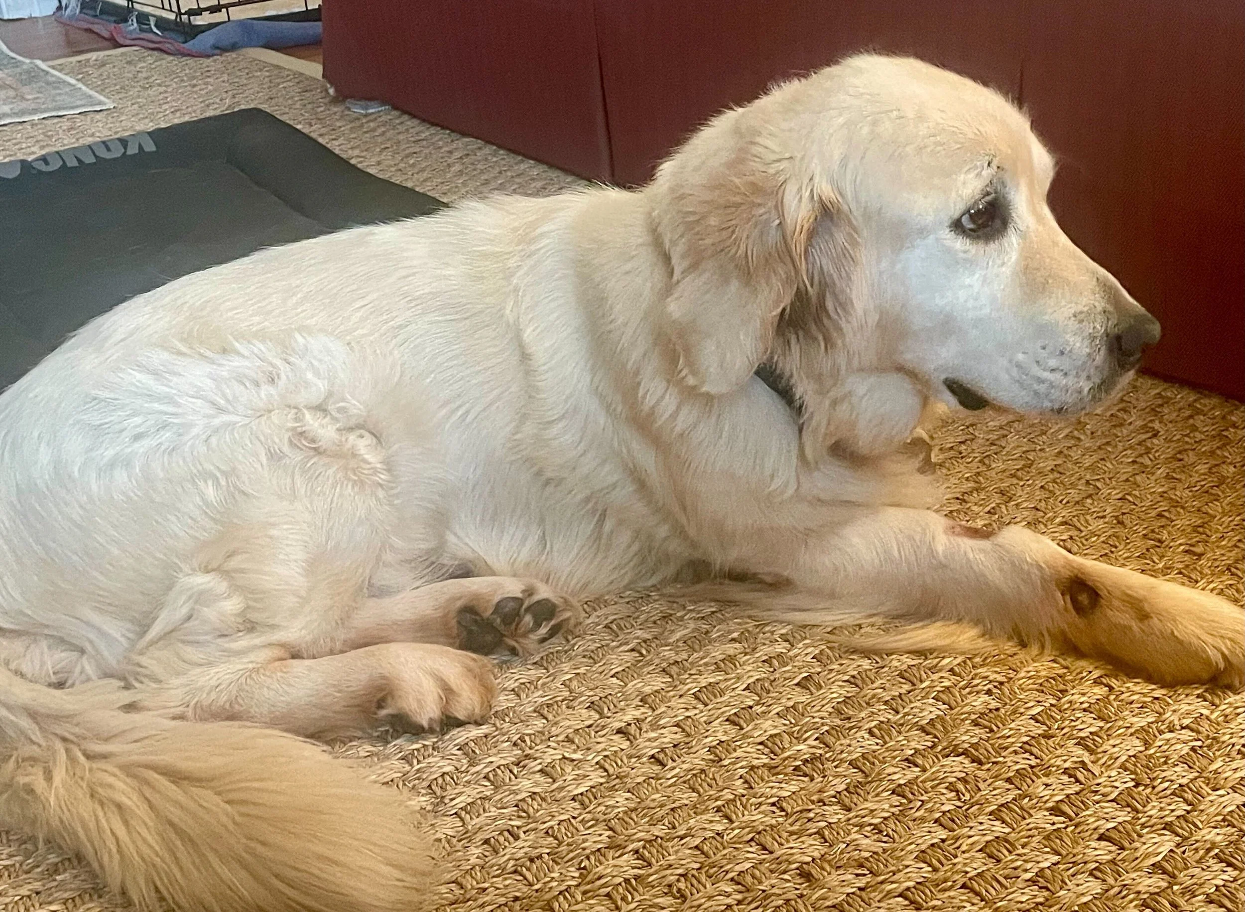Geneva loves her people and wants nothing more than to snuggle on the couch getting and giving all the loves! She does have some hesitation about walking on hardwood floors but feels very comfortable staying on a rug path through the house. Think of it like playing “The Floor is Lava” !! She knows her limits. She would do best in a home with carpeting or a home that will accommodate her with area rugs and runners.