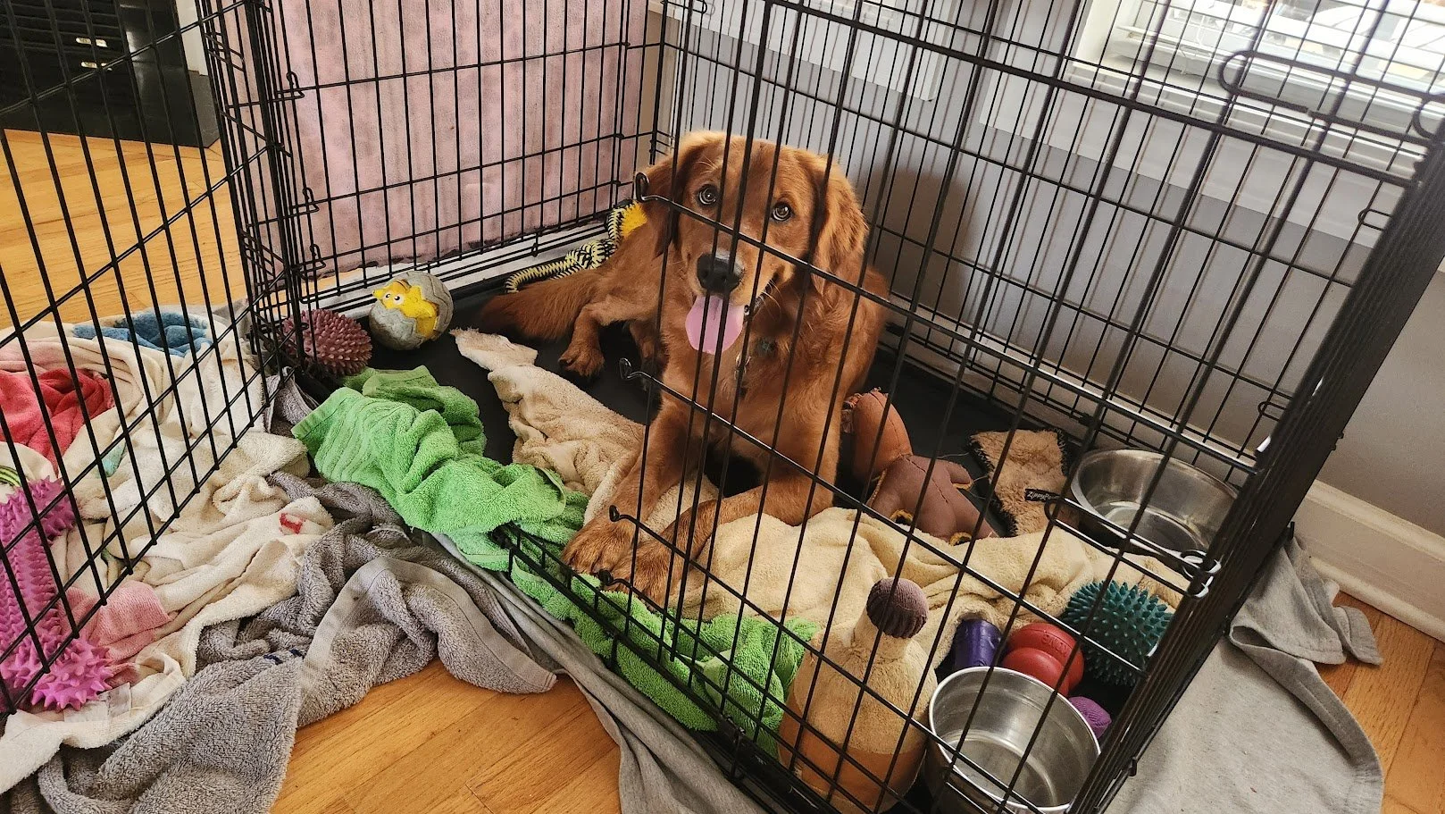 Grey's favorite spot in the world is his crate, where he can retreat and find comfort whenever he feels overwhelmed. He is also a master collector, hoarding all sorts of items- like toys, shoes, blankets, towels, pillows, remote control and anything within reach- and brings them into his crate. He is also an expert toy de-stuffer.