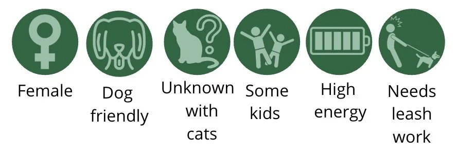 Val will do best with a committed adopter who can provide structure, consistency, and continued training. She is highly motivated to please, learns quickly, and has so much untapped potential. With guidance and leadership, she will absolutely blossom into an incredible companion.